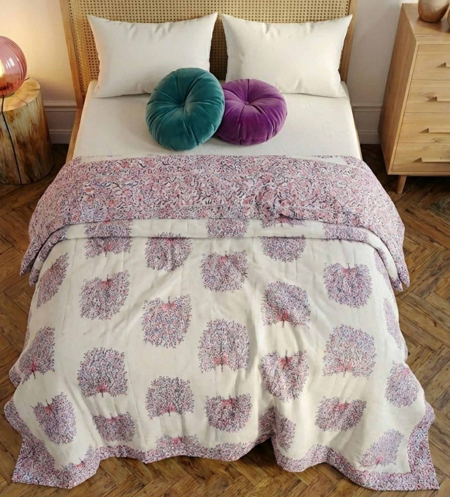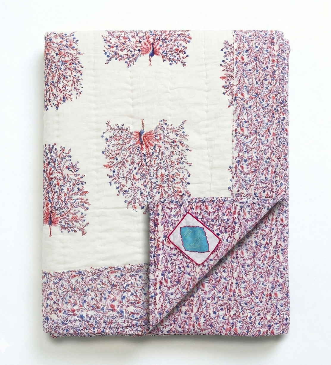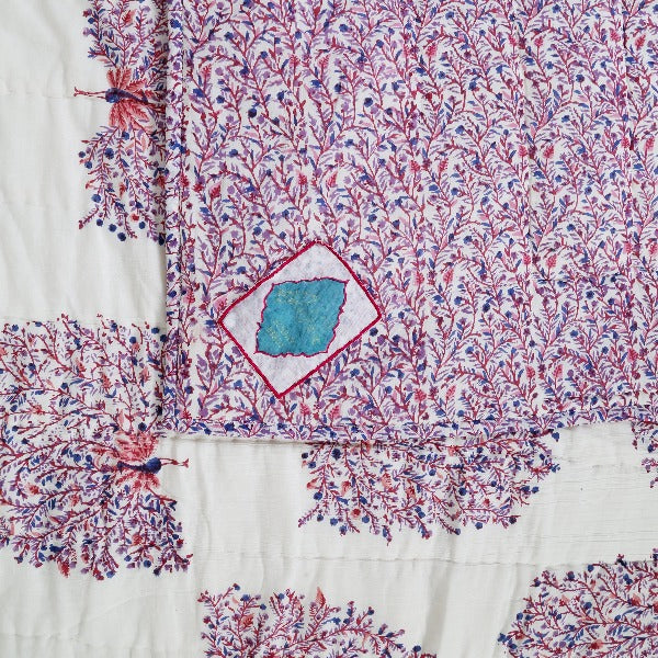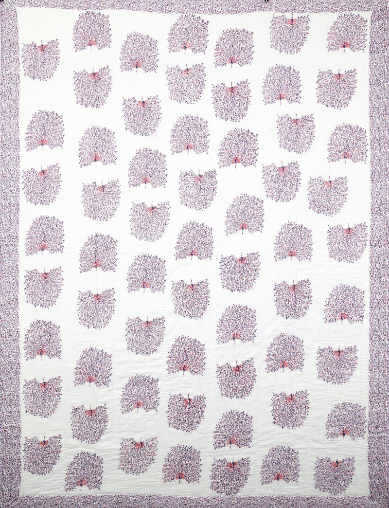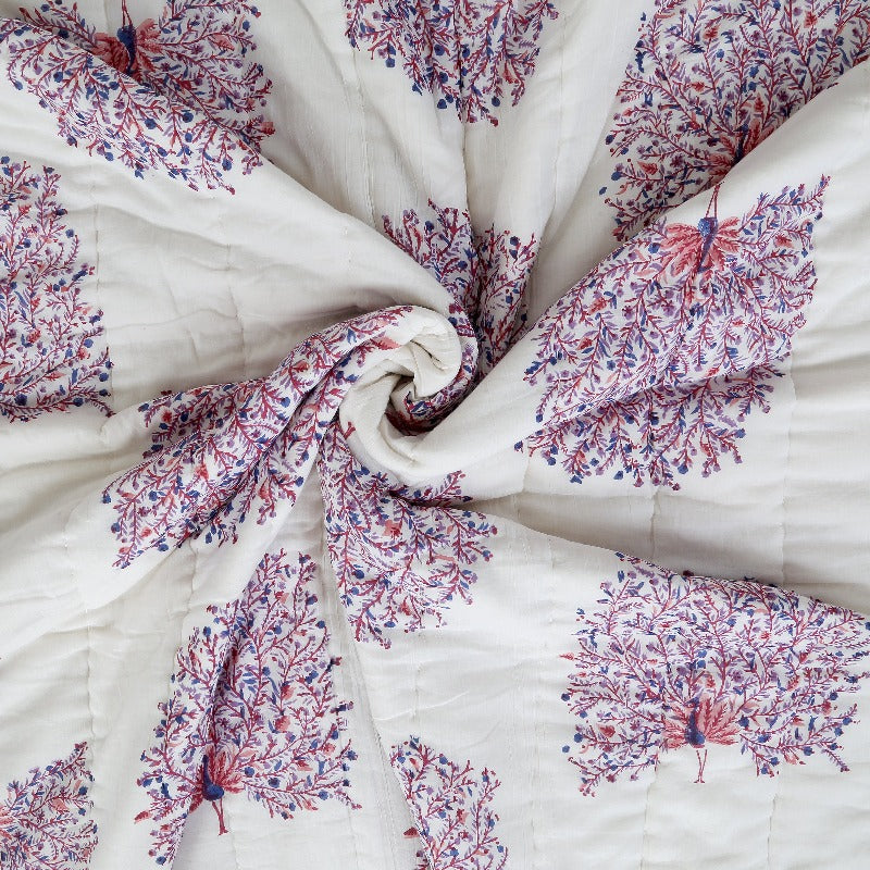 Dieser exquisite, von Hand blockbedruckte Wende-Quilt ist von der Schönheit des indischen Pfaus inspiriert. Der PEACOCK FEATHERS Quilt zeigt große Pfauen in Blau, Lila und Rosa auf einer organischen weißen Basis, die sich auf der Rückseite in dichte Blumenranken umkehrt. Dieser Quilt wird in liebevoller Handarbeit von den Handwerkerinnen in Rajasthan gefertigt. Langsam hergestellt aus 100% Baumwolle innen und außen, ist diese Decke perfekt für eine leichte Wärmeschicht oder als atemberaubende Bettdecke. Verleihen Sie Ihrem Zuhause einen Hauch von Bohemian Chic.