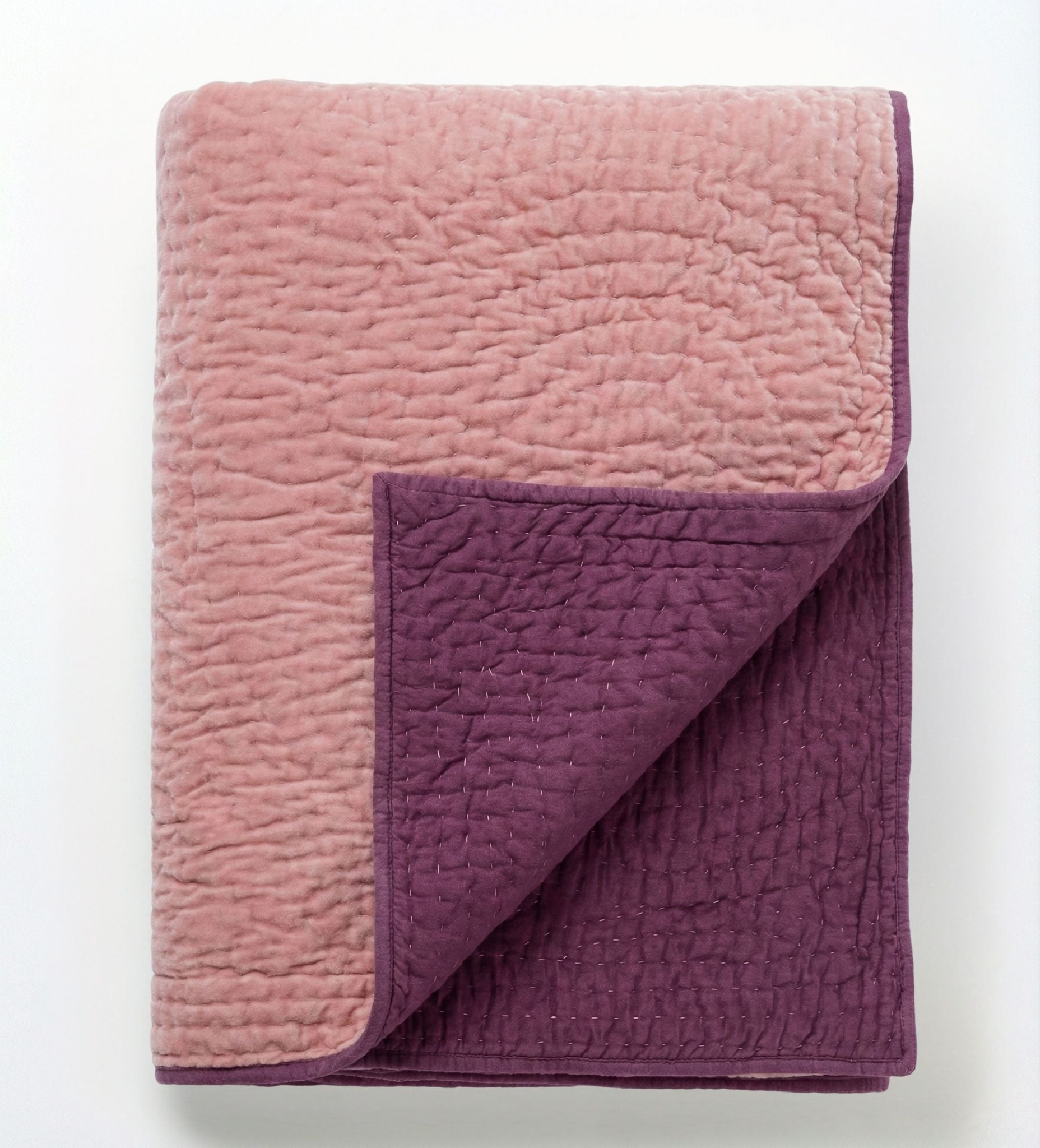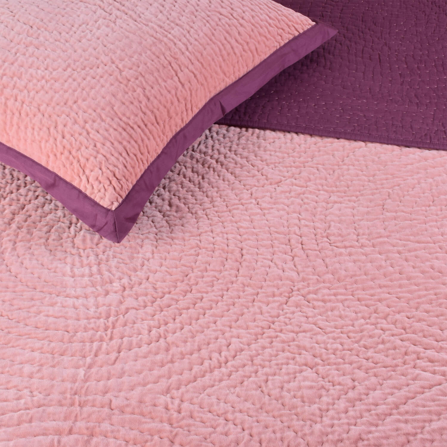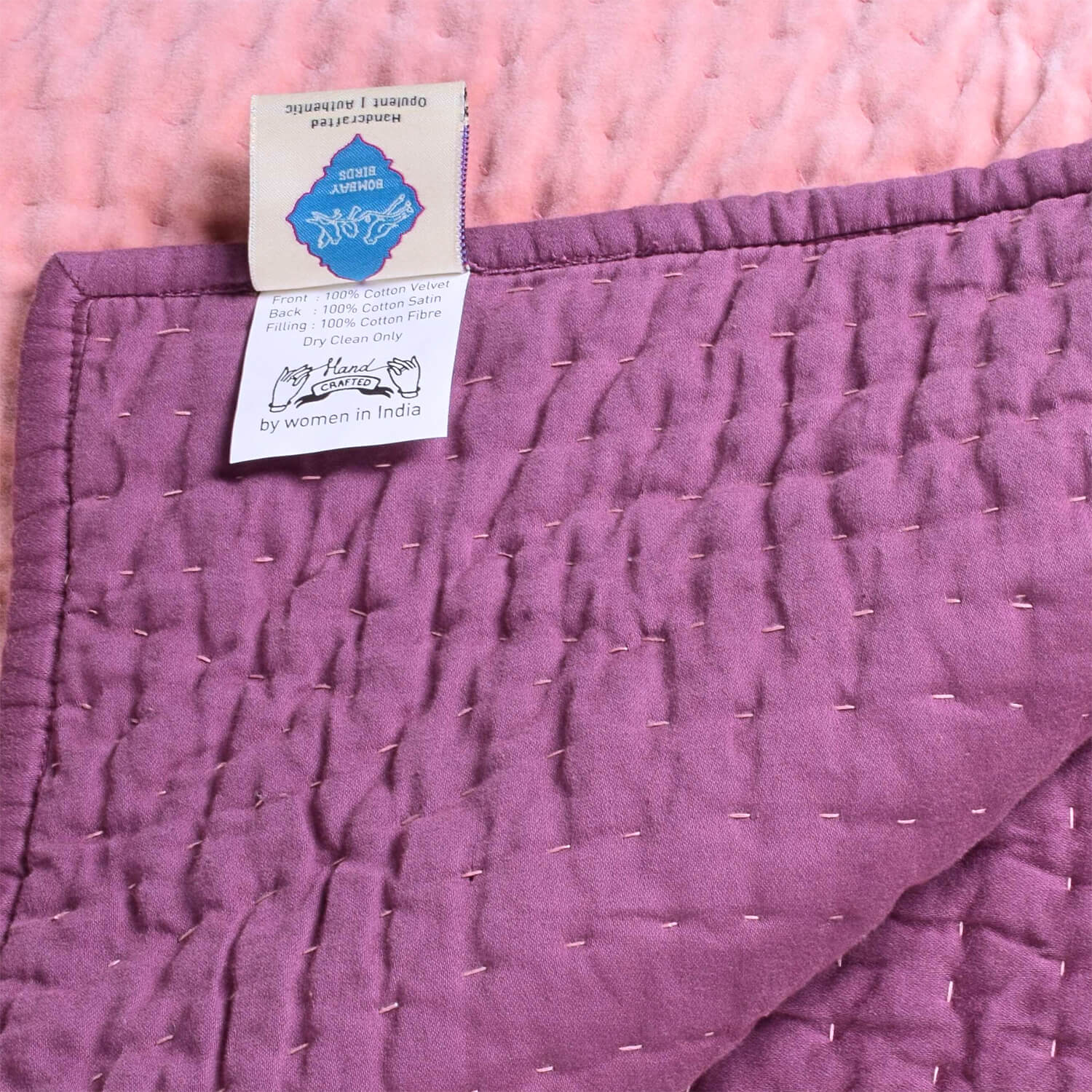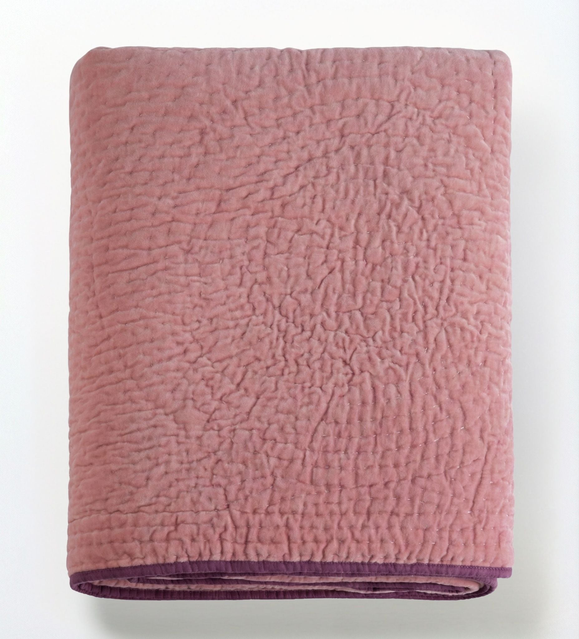 Dieser weiche und gemütliche Quilt wurde entworfen, um Ihrem Schlafzimmer reiche Farben und eine luxuriöse Atmosphäre zu verleihen. Er verfügt über einen plüschigen hellrosa Baumwollsamt auf der einen Seite und einen glatten tiefen Beeren-Baumwollsatin auf der Rückseite. Das gesamte Stück ist von Hand in einem aufwendigen Kreismuster genäht. Gefüllt mit 100% atmungsaktiver Baumwolle, ist diese tröstliche schwere Schicht perfekt für tiefen Schlaf oder als stilvoller dekorativer Überwurf. Er wird liebevoll von den Handwerkerinnen in Rajasthan gefertigt, eine wunderschöne Widerspiegelung unseres ethischen Engagements.