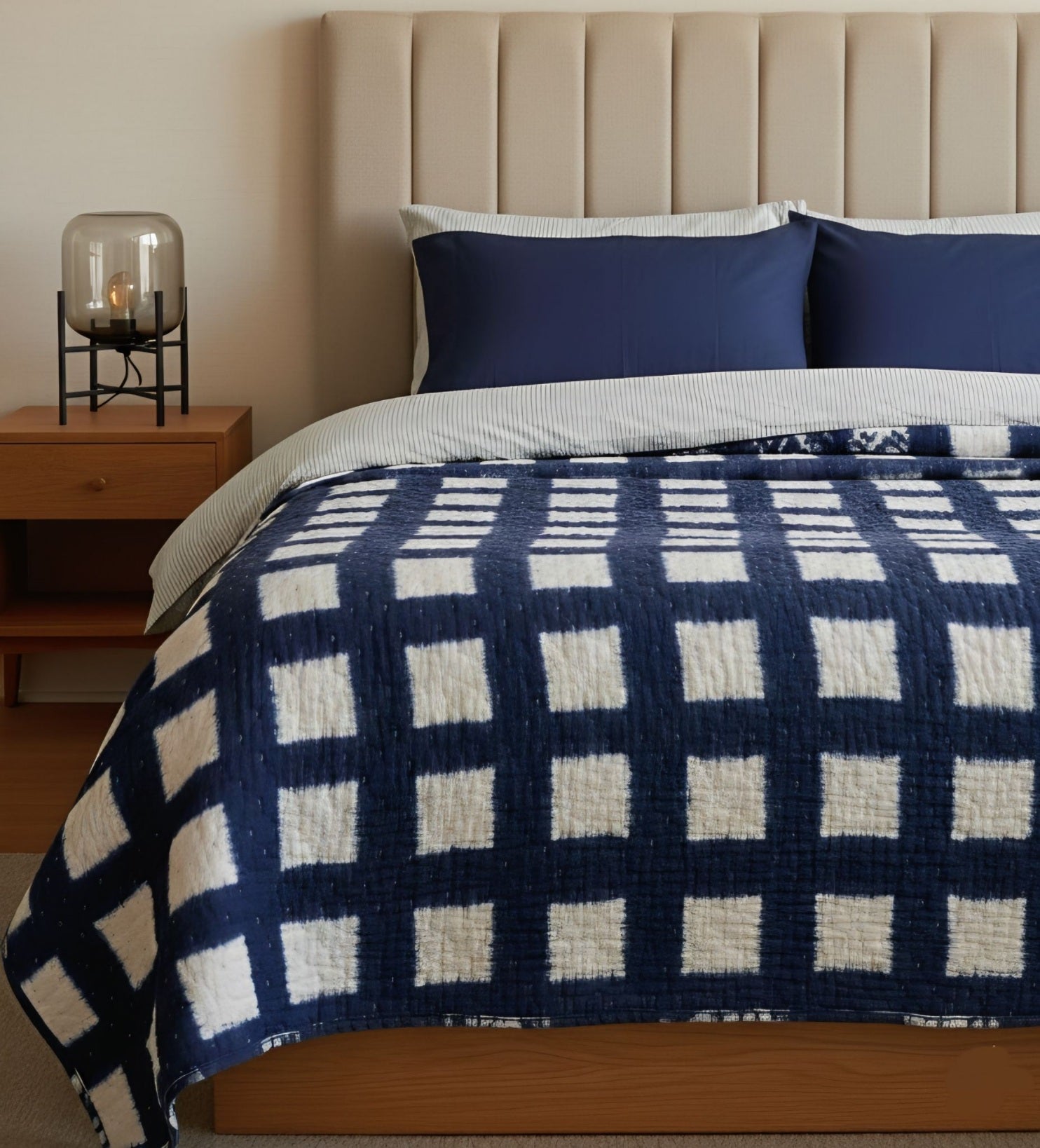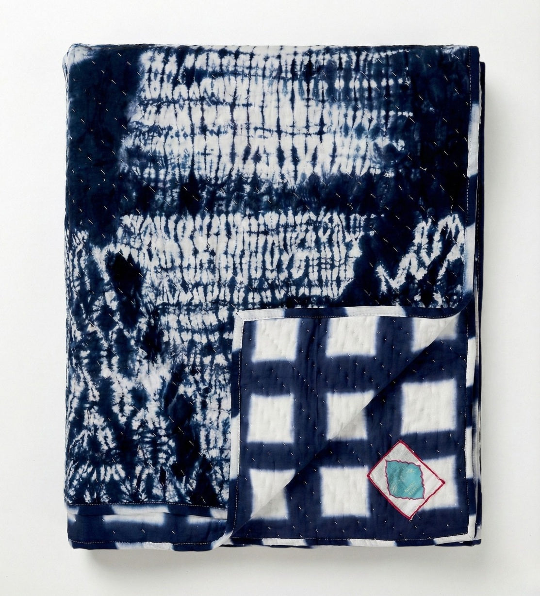 Eine wendbare, handgefertigte Decke mit Batikmustern. Der INDIGO SHIBORI Quilt präsentiert ein kühnes Karomuster, das sich in ein kompliziertes abstraktes Design in wunderschönem Indigoblau und Weiß umkehrt. Der Quilt wird in liebevoller Handarbeit von den Handwerkerinnen in Rajasthan gefertigt. Langsam hergestellt aus 100% Baumwolle innen und außen, ist diese atmungsaktive Decke perfekt für warme Sommernächte oder zum Schichten auf einem Bett oder Sofa. Setzen Sie einen fantastischen handgefertigten Akzent in Ihrem schönen Zuhause.