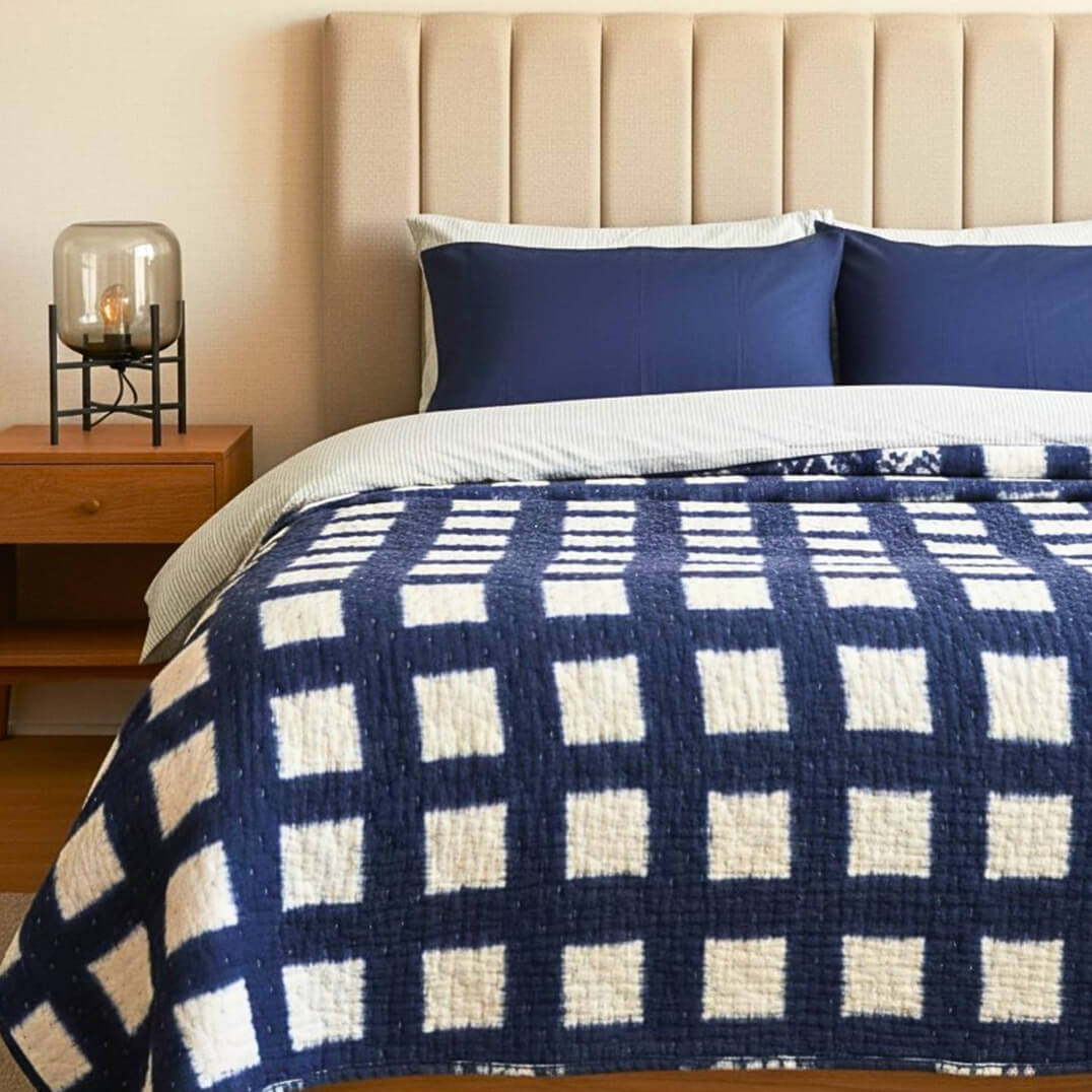 Die Indigo Shyburi Wende-Decke von Bombay Birds ist weit mehr als nur eine Decke – sie ist ein kunstvolles Meisterwerk. Gefertigt mit jahrhundertealten Knot und Färbetechniken nach der traditionellen Shibori-MethodeUnikat und ein Ausdruck bewusster Eleganz sowie Slow Fashion. Mit einem faszinierenden Karo-Shibori auf der einen Seite und einem künstlerisch abstrakten Muster auf der anderen, bietet ihr wendbares Design ultimative Flexibilität und Tiefe