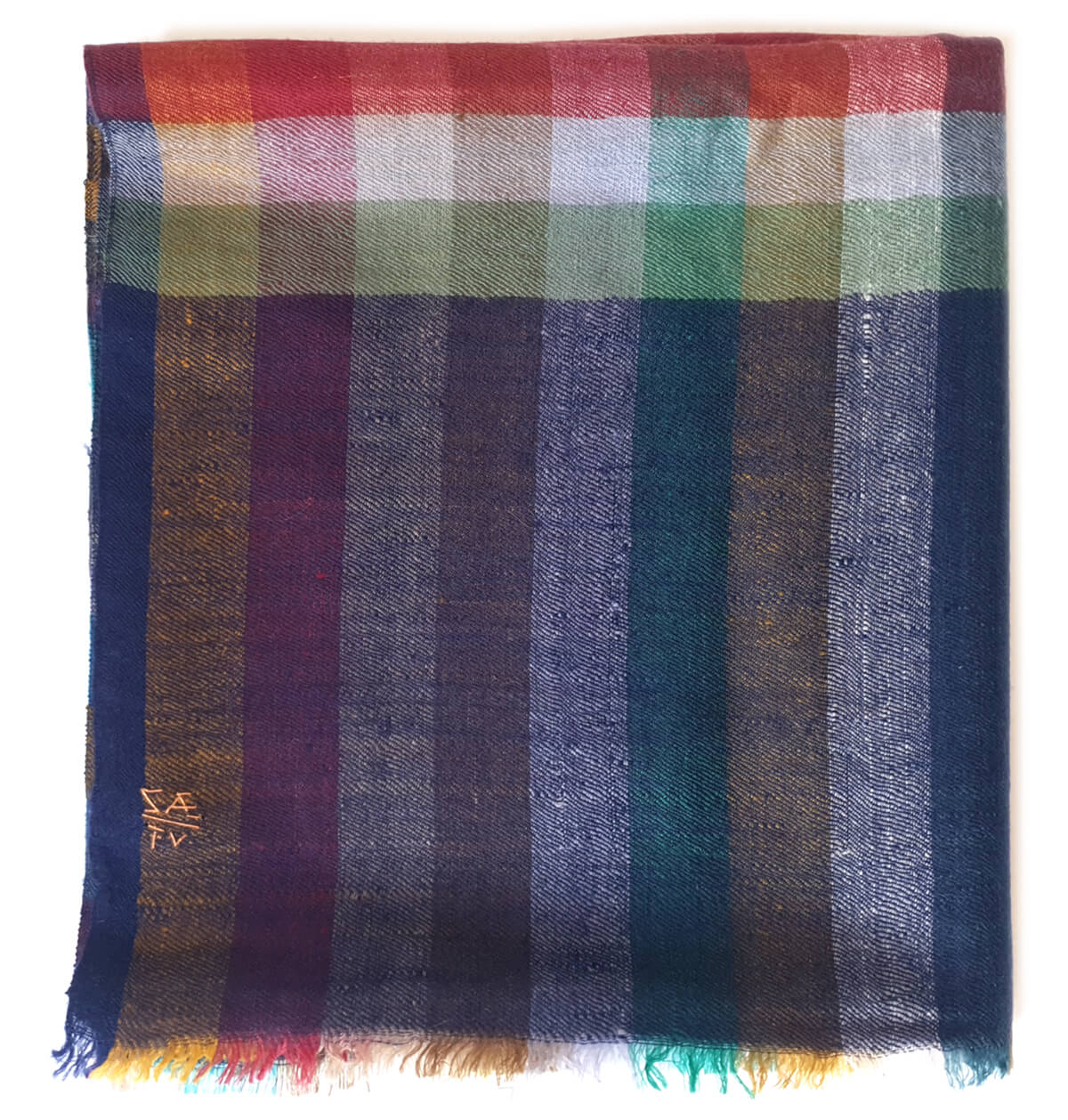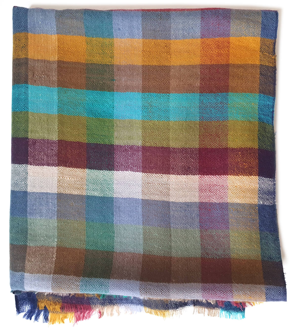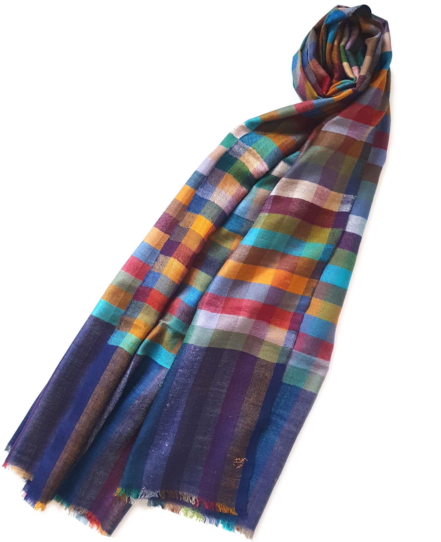 Dieser umwerfende KYLE Pashmina Schal präsentiert ein faszinierendes Ombre-Karomuster, das von tiefem, tintenartigem Marineblau und Violett zu einem lebhaften karierten Hauptteil übergeht, der sattes Burgunderrot, Olivgrün und warmes Gelb aufweist. Dieses einzigartige Stück ist unglaublich leicht und eine großartige Ergänzung für die moderne Garderobe. Perfekt für ein bedeutungsvolles Geschenk. Dieser in Kaschmir handgewebte Schal ist ein echtes Zeugnis von Slow Craftsmanship—er erfordert über 90 Stunden hingebungsvoller Handwerkskunst, um die feinsten Kaschmirfasern in luxuriöses Pashmina zu verwandeln.