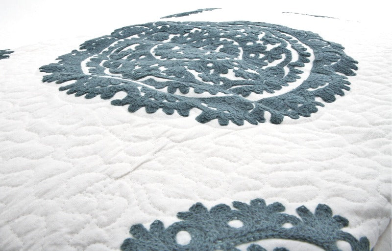 La technique utilisée pour suzani est le point de chaînette, qui est réalisé avec un outil appelé tambour, un crochet qui perce le tissu et tire le fil à travers le motif par derrière.